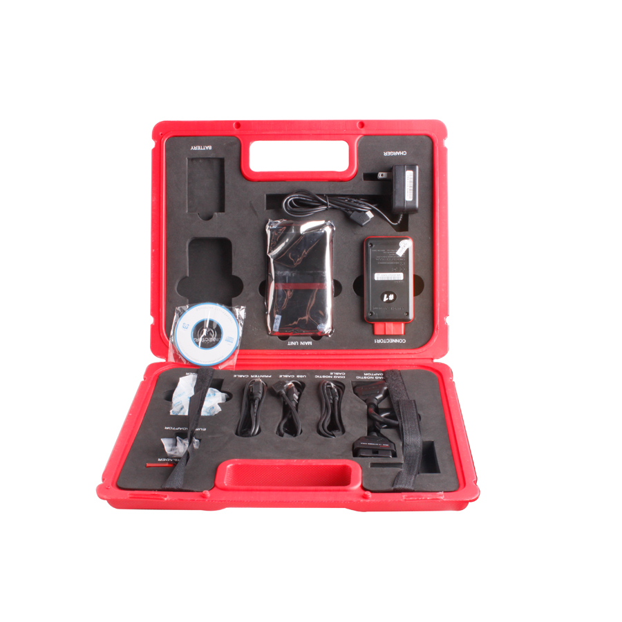 Mala vermelha é composta por: Máquina, software, unidade de leitura bluetooth OBDII, carregador e bateria.